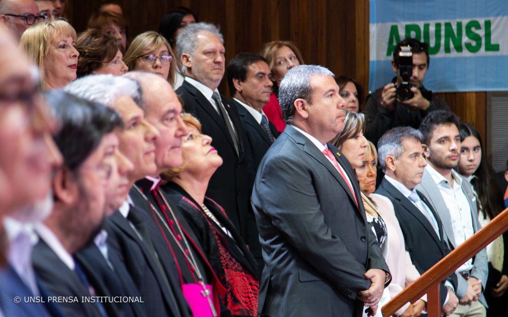 La ceremonia principal de autoridades comenzó pasadas las 11:00 horas. El rector saliente, Dr. Félix Nieto Quintas, le tomó el juramento al actual rector de la Universidad Nacional de San Luis (UNSL) CPN. Víctor Moriñigo, quien juró llevar adelante una gestión profundamente democrática y plural en su período 2019-2022.